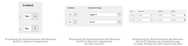 Nehmen wir an, Sie möchten Ihrem Shop ein Banner hinzufügen, den Sie jenach Log-in Status des Nutzers aktivieren oder deaktivieren möchten, da es aufbeispielsweise auf Aktionen hinweist, die nur für eingeloggte Nutzer gelten. Außerdemmöchten Sie festlegen können, in welchen Zeiträumen dieses Banner angezeigtwird: