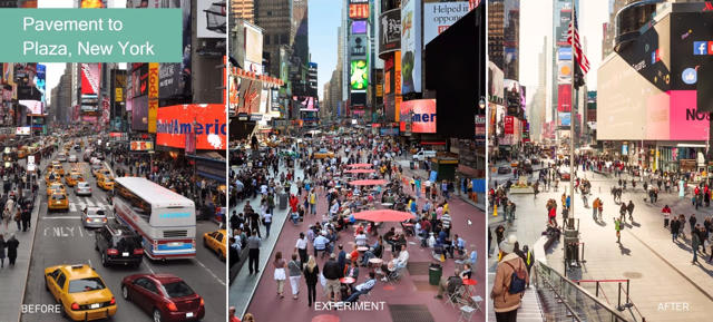 Ich gebe ein Beispiel aus der Stadtarchitektur, das hilft, die Idee des MVPs zu verstehen. Es handelt sich um den Wiederaufbau des Times Square 2010-2017. Was ein MVP in der Praxis bedeutet, sieht man, wenn man das Bild in der Mitte betrachtet. Die Fußgängerzone wurde zunächst als temporärere Lösung eingeführt, um zu beobachten, ob und wie es von der Bevölkerung angenommen wird und wie sie genutzt wird.