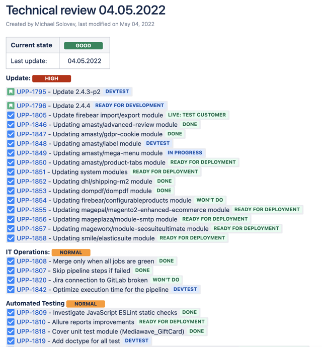 Unsere Lösung bestand in diesem beispielhaften Projekt darin, alle ein bis zwei Monate ein technisches Review vorzunehmen. Das Ziel ist es hierbei, die Logs, die angeschlossenen Dienste und unseren benutzerdefinierten Code zu überprüfen sowie Aktualisierungen der von uns verwendeten Module und neuen Funktionen des Frameworks vorzunehmen. Auch die Erstellung von Folgetickets, um Fehler zu beheben, Funktionalitäten weiterzuentwickeln und Code zu bereinigen gehört dazu. Das alles hilft dabei, die Eigenverantwortung des Entwicklerteams zu stärken und um das Projekt permanent in einem guten Zustand zu halten.